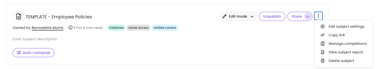 Navigate to the "Content" page from the left-hand menu and click on the section where your subject lives (Company, Polices, or Processes.)