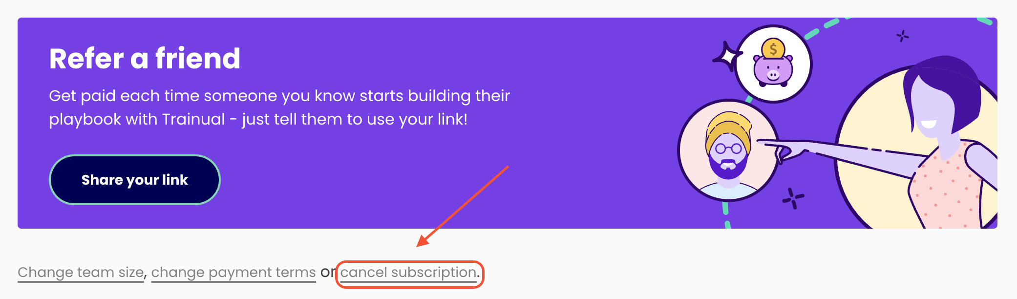 Scroll to the very bottom of this page and click the "cancel subscription" link under the "Refer a friend" banner to open up the different menu options to take on the account. Don't worry — we aren't canceling. 😉