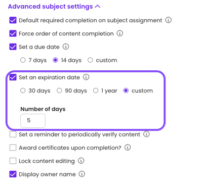 📝 Please note: Subjects with expiring completions will schedule a completion reset for the designated number of days based on the date each person first completed the subject. This means that the expiring completion dates will likely differ for each of your teammates assigned to the subject, no matter what day they were initially assigned it.