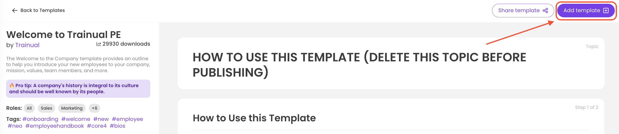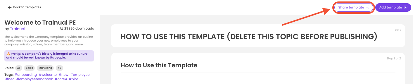 🔥 Tip: To share a template with people outside of your company's organization, provide them with the full title of the template and this help article link. For those outside of Trainual entirely, share the template page with them instead. 😌