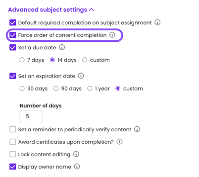 Learn how to ensure your team members consume topic and step content under a single subject in a specific order.