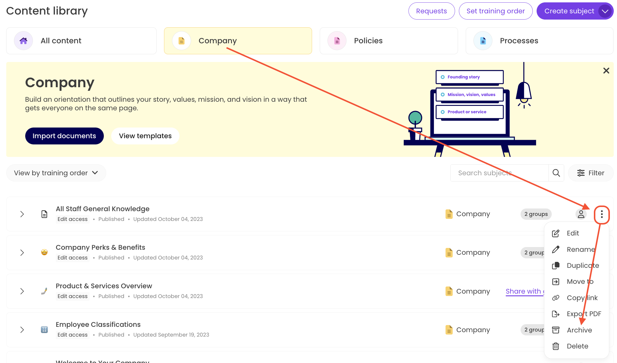 🔥 Tip: Can't seem to find a piece of content you know you were working on creating? It was likely moved to the archived section. Take a peek there, and if you still can't find it, reach out to Trainual support with all the subject details for some extra backup. 💪