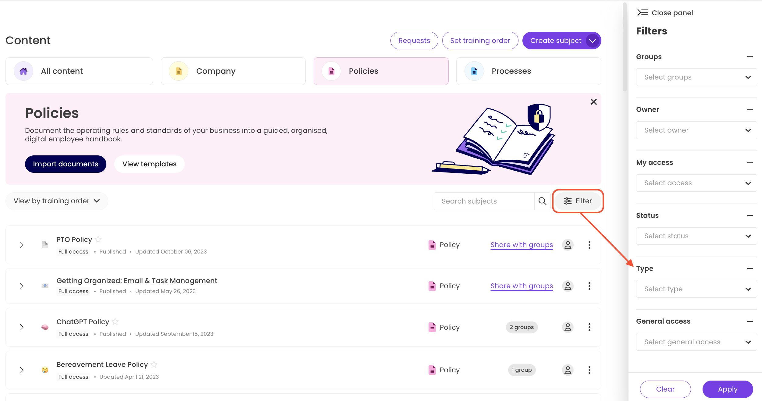 Locate your existing subject by searching within the tab and under the title where it currently "lives" — Company, Policies, or Processes.