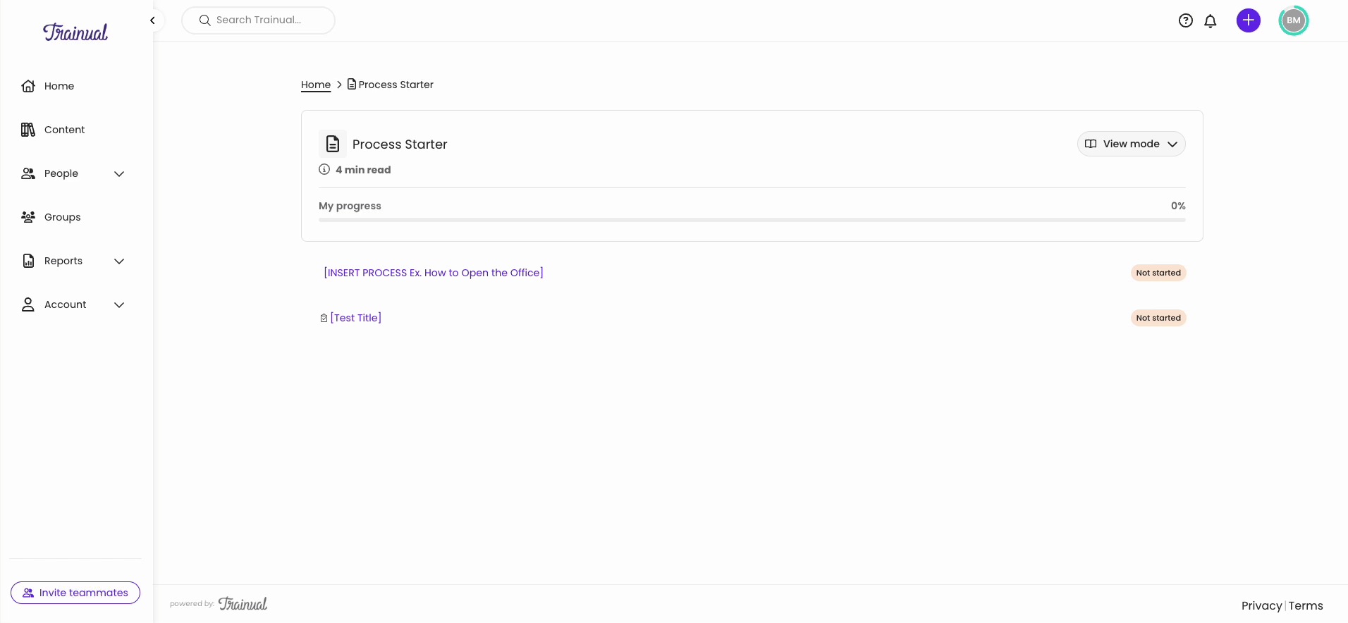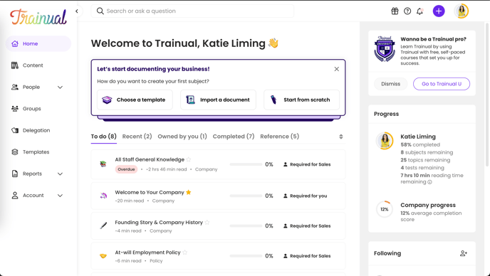 Everyone with a Trainual log-in will have their very own home page. This is the first place your teammates will consume content from using their "To do" list.