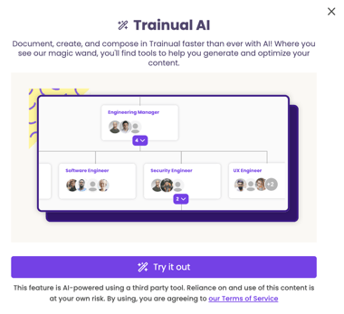 π Please note: If this is your first time using the Trainual AI role chart, you will also see an overview pop-up screen that outlines the feature and a note about agreeing to the Terms of Service before proceeding. For any questions or concerns, the support team is available at support@trainual.com.