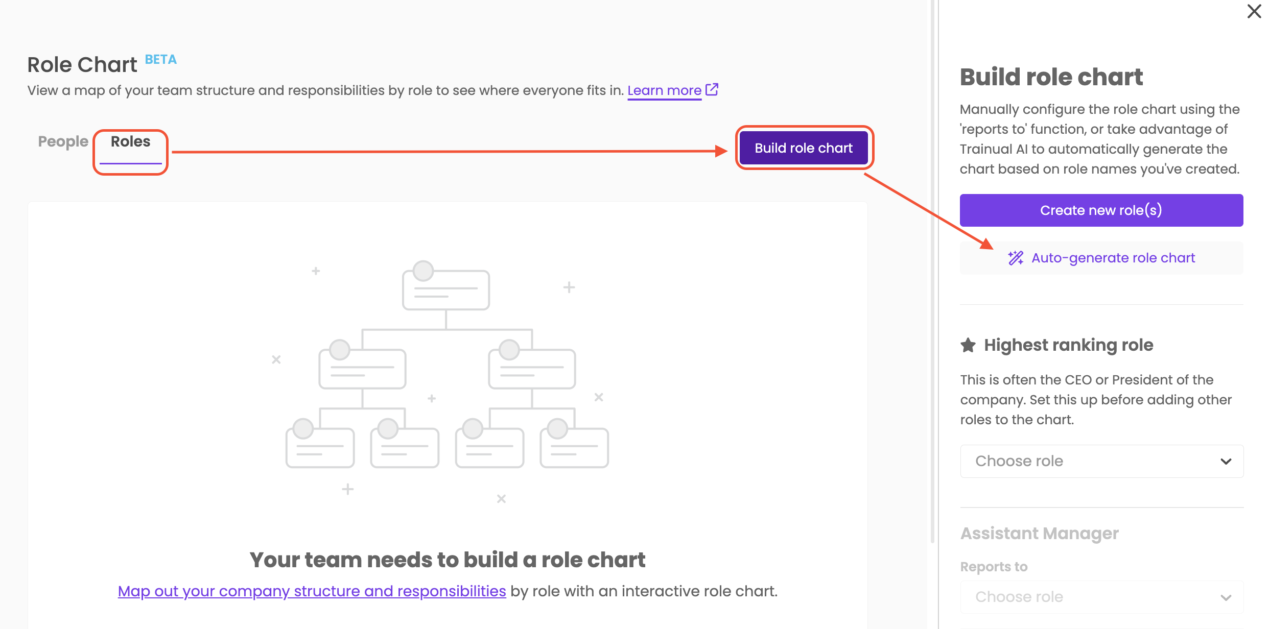 Select the βAuto-generate role chart button,β and Trainual AI will create a complete role chart using all the roles in your account.