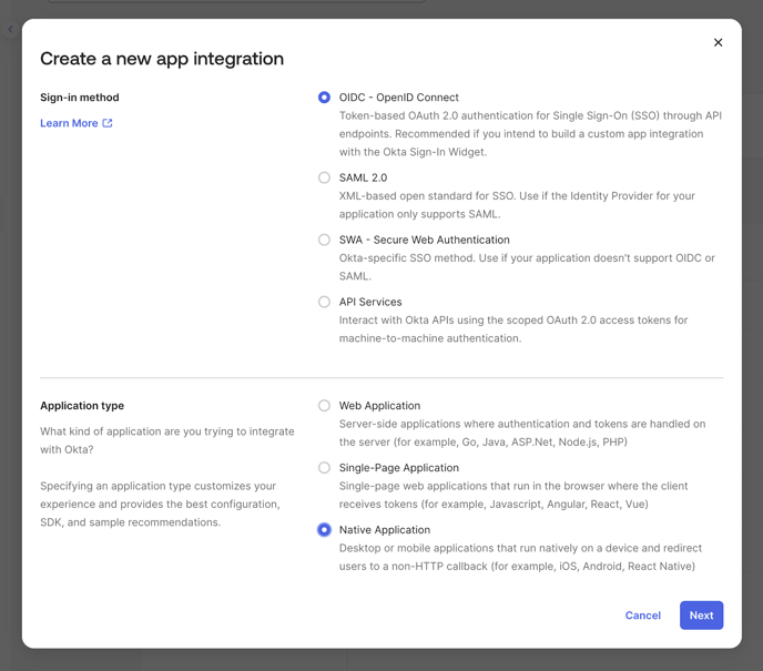 Select βOIDC - OpenID Connectβ as the sign-on method.