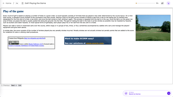 Moving through SCORM content will differ from other Trainual content. Navigation in a SCORM course depends on how it was set up in the original SCORM .zip file. Additionally, once a user completes the content, the "Back to Home" button will then appear below it. ![]() |