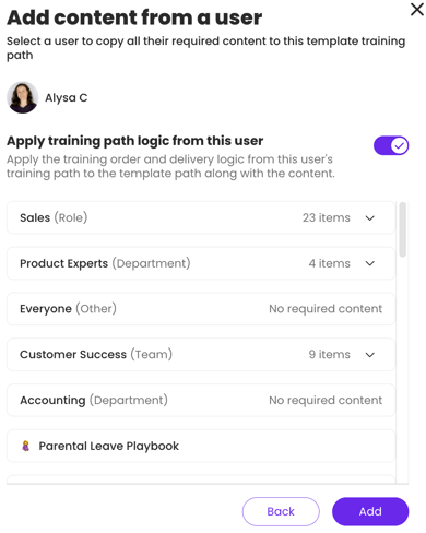 💡 Example: Let’s say you’re onboarding a cohort of five new Sales Associates who will be working remotely. You already have a sales associate who works remotely and they are assigned all the content your new hires will need (like relevant sales processes and remote policies). Pick “Add from user” to automatically populate your training path template with all of that person’s assigned groups and content to kickstart setup.