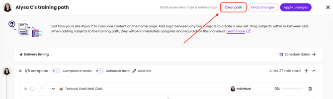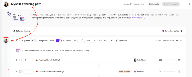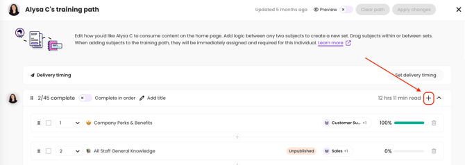 📝 Please note: Adding content directly from a training path page will instantly assign the subject to the user, even if you have not hit “Apply changes.”
