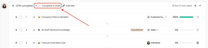 Turning on the “Complete in order” setting ensures your employees complete assignments one at a time and in order by locking access to their next subjects.
