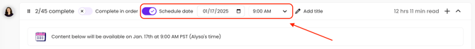 Setting a scheduled date for content sets makes them available on a specified date, regardless of any previous set's completion statuses.