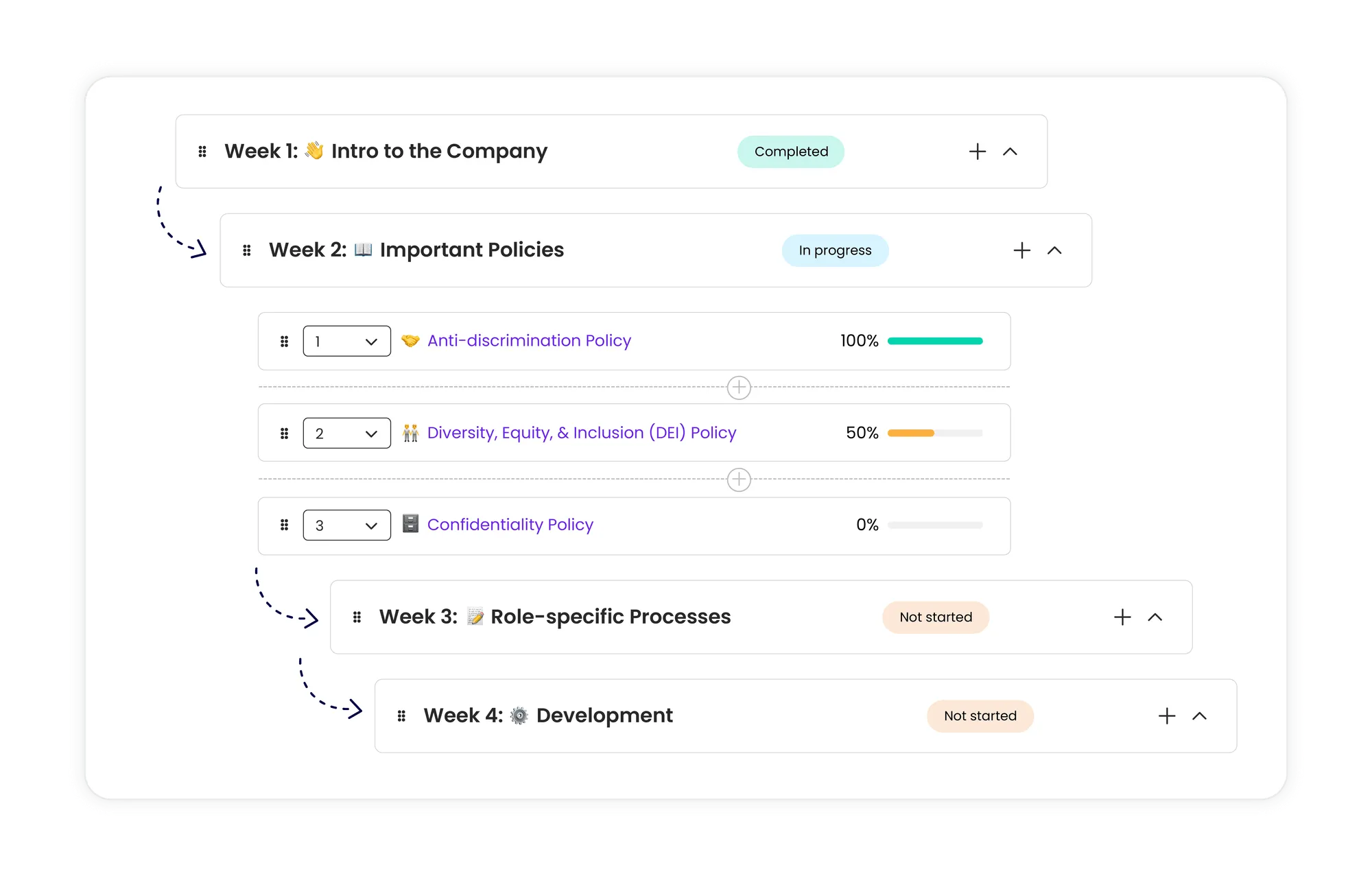 Tailored training paths set clear learning milestones for teammates, ensuring focus on relevant subjects and skills and avoiding overwhelm.