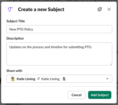 - 📓 Creating and capturing knowledge. Spot knowledge worth scaling? Build a new subject, document, or page directly from any Slack conversation.