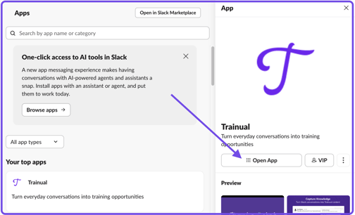 Now that the integration is set up, each teammate will need to connect to the Trainual app in Slack to start using the integration features. Here's how...👇