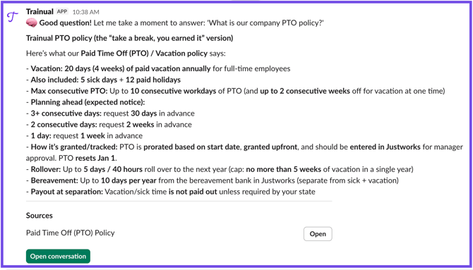 - Open button — Jump into the exact Trainual content the AI Assistant sourced its answer from.