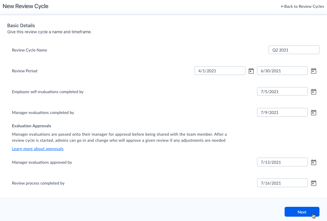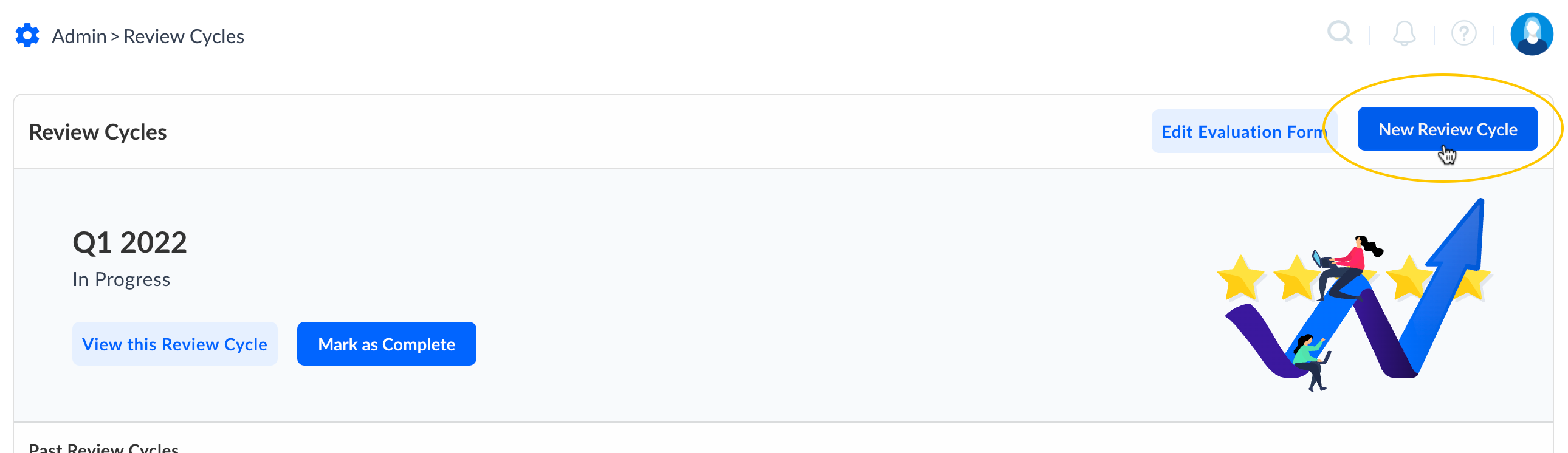 Click "New Review Cycle" in the upper right corner of the Review Cycles page: