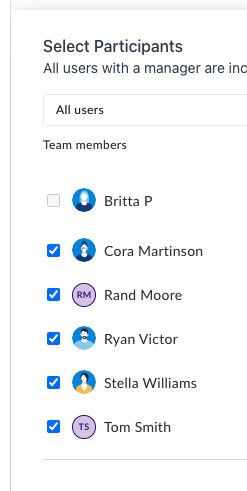 All users in Uptick (except those who do not have a manager assignment) are selected by default to be included in the review cycle, but can be deselected if they should be excluded.
