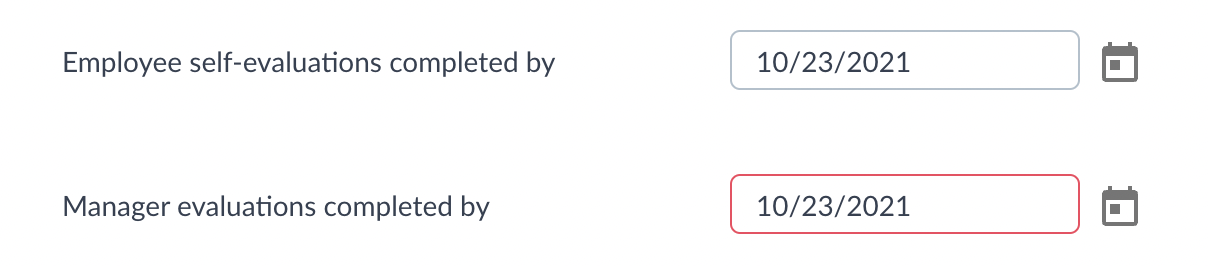 Each date field must be in the future from the previous date field. All dates for the steps of the review (self-evaluation, manager evaluation, etc.) must come after the review period end date.