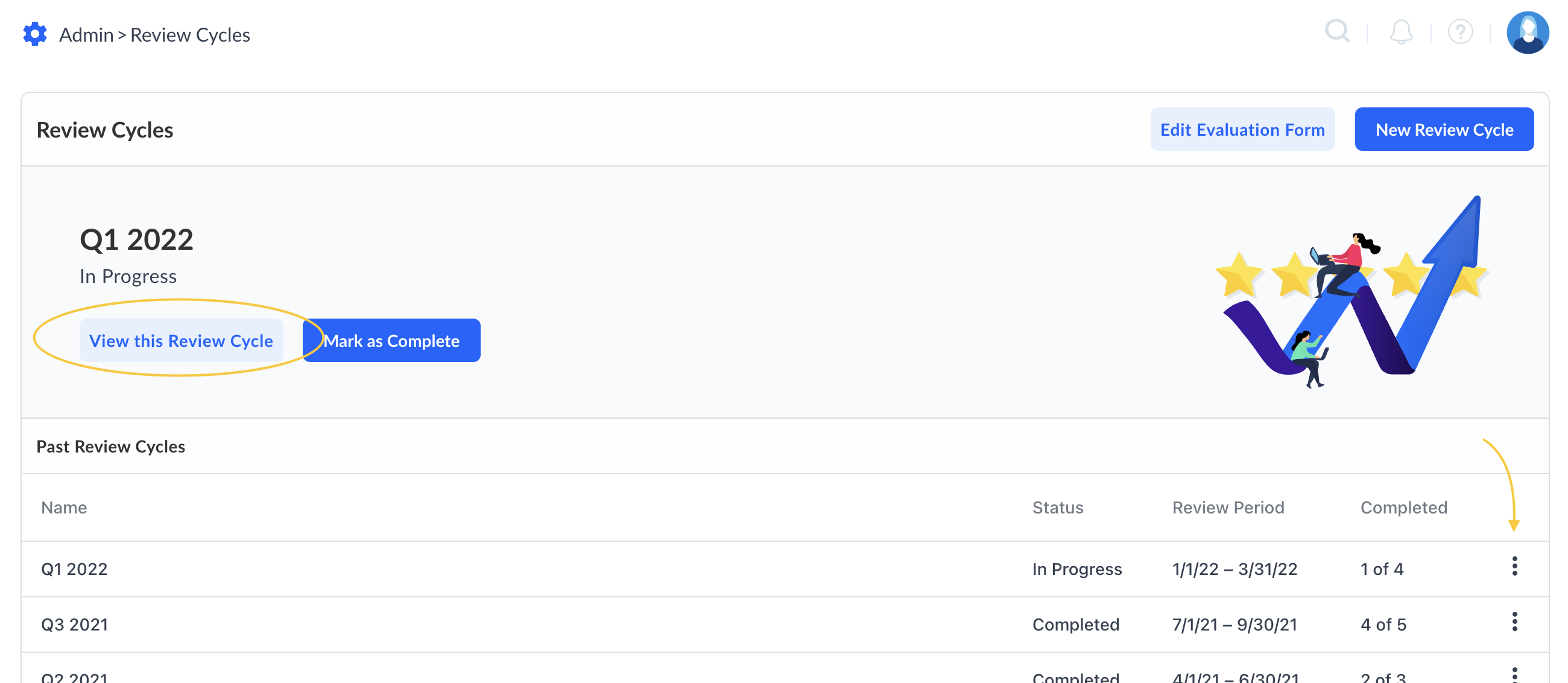 Admins are the only users who can create and manage review cycles, and edit the evaluation form.