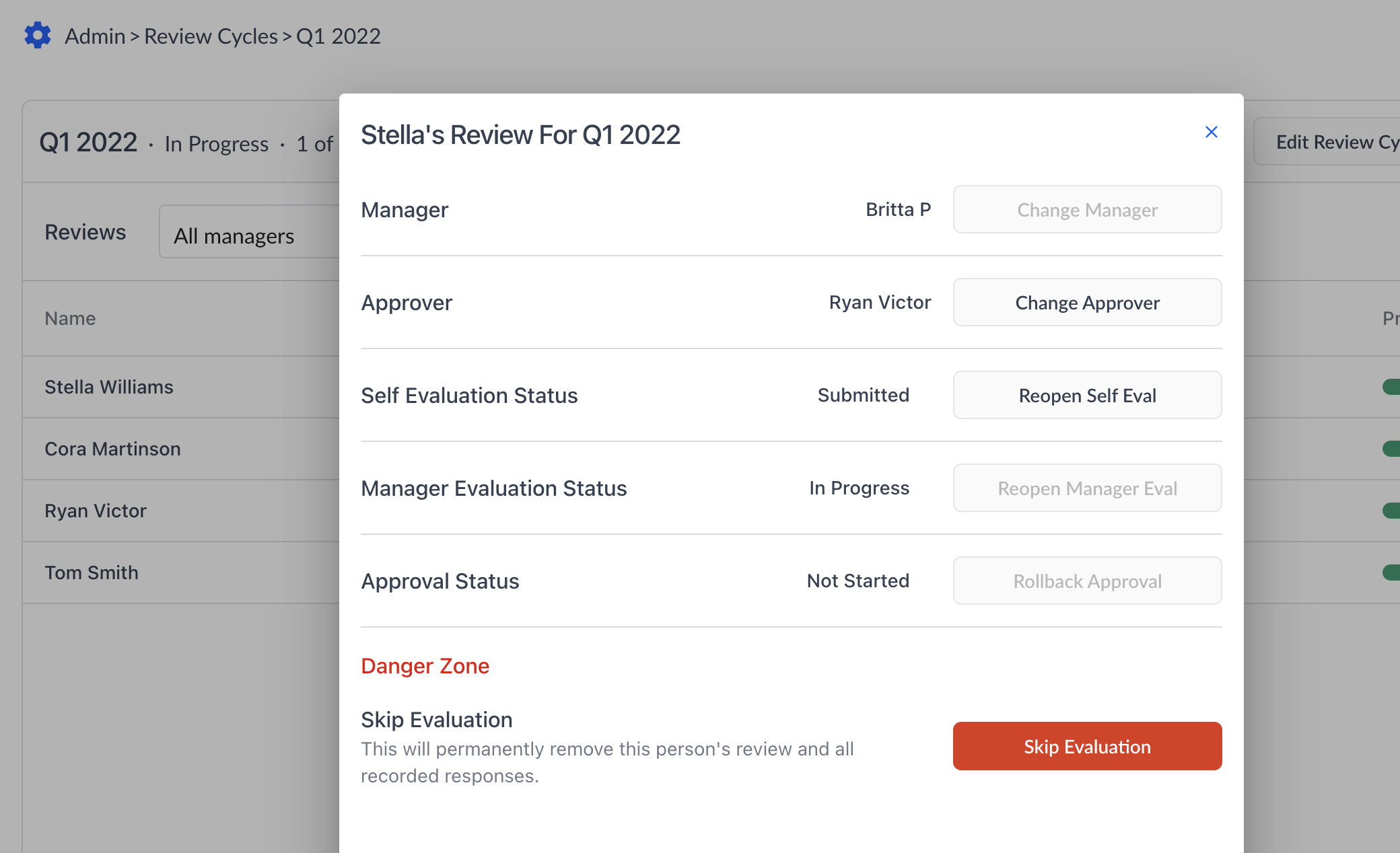 Admin can see the status of reviews and take actions such as re-opening a manager's evaluation, if revision is desired.