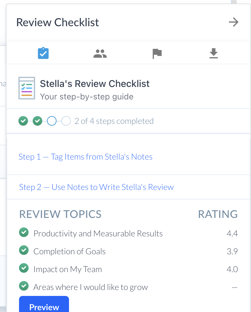 The side menu displays all the review steps, and you will see available actions per your role, such as previewing or submitting the evaluation.