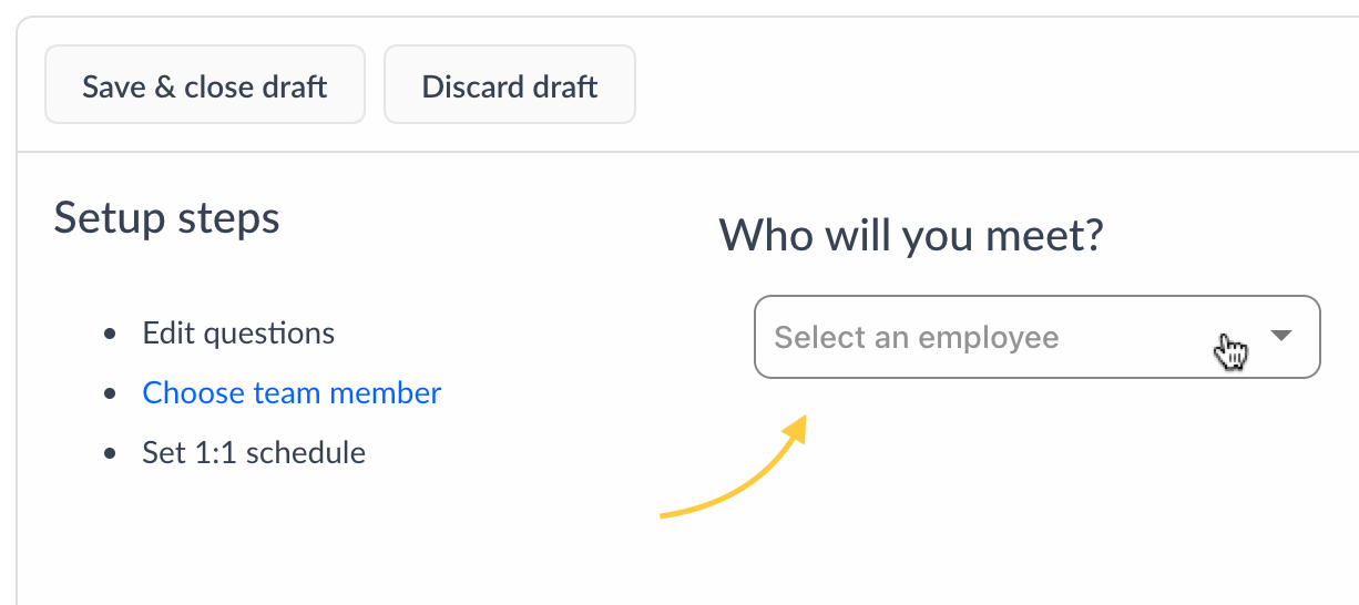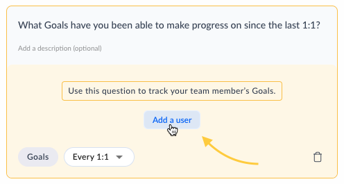 Anyone can add a user through the setup of a new 1:1. Once you have selected the questions you want to use, the second step of the 1:1 setup process is to select or create a new user.