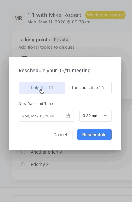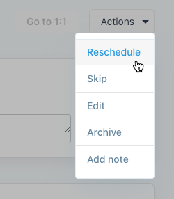 Managers can reschedule a single meeting occurrence from the Actions menu on the My 1:1s page. Only the upcoming (or "current") meeting can be rescheduled.