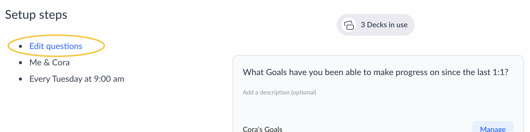 Click "Add question" at the bottom of the page to add additional questions, like a custom question or a Deck. Decks are collections of questions organized by topic, that give you variety each time you meet. (Read more about Decks.)