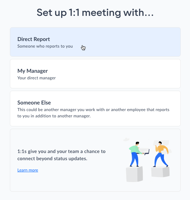 Are you meeting with a direct report, "my manager" (where a team member can initiate the 1:1 setup), or "someone else"?