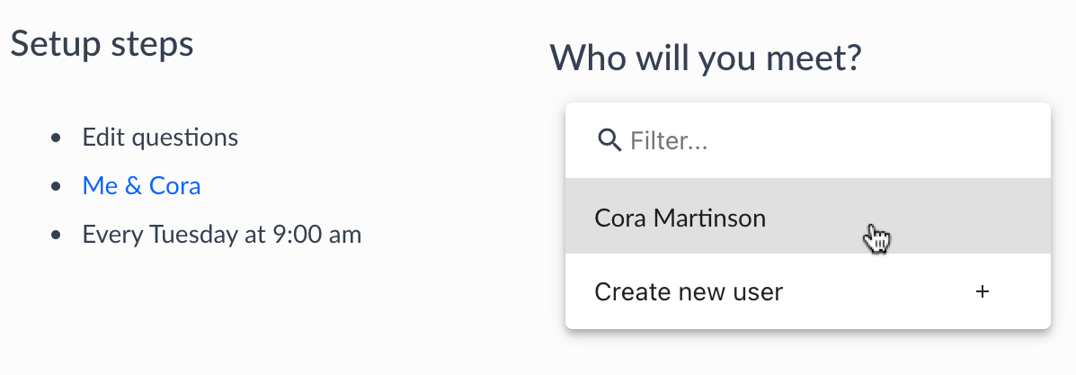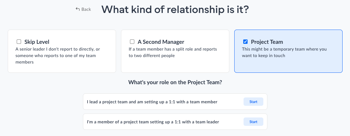 Step 1: When you are setting up a 1:1, the first step is to choose what kind of a 1:1 it is (who you are going to meet with):