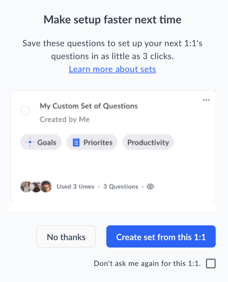 If you have any question sets created, you will see them appear below the templates section as options to choose from. A set is a grouping of 1:1 questions created by a manager to use across their team. Read more about question sets.