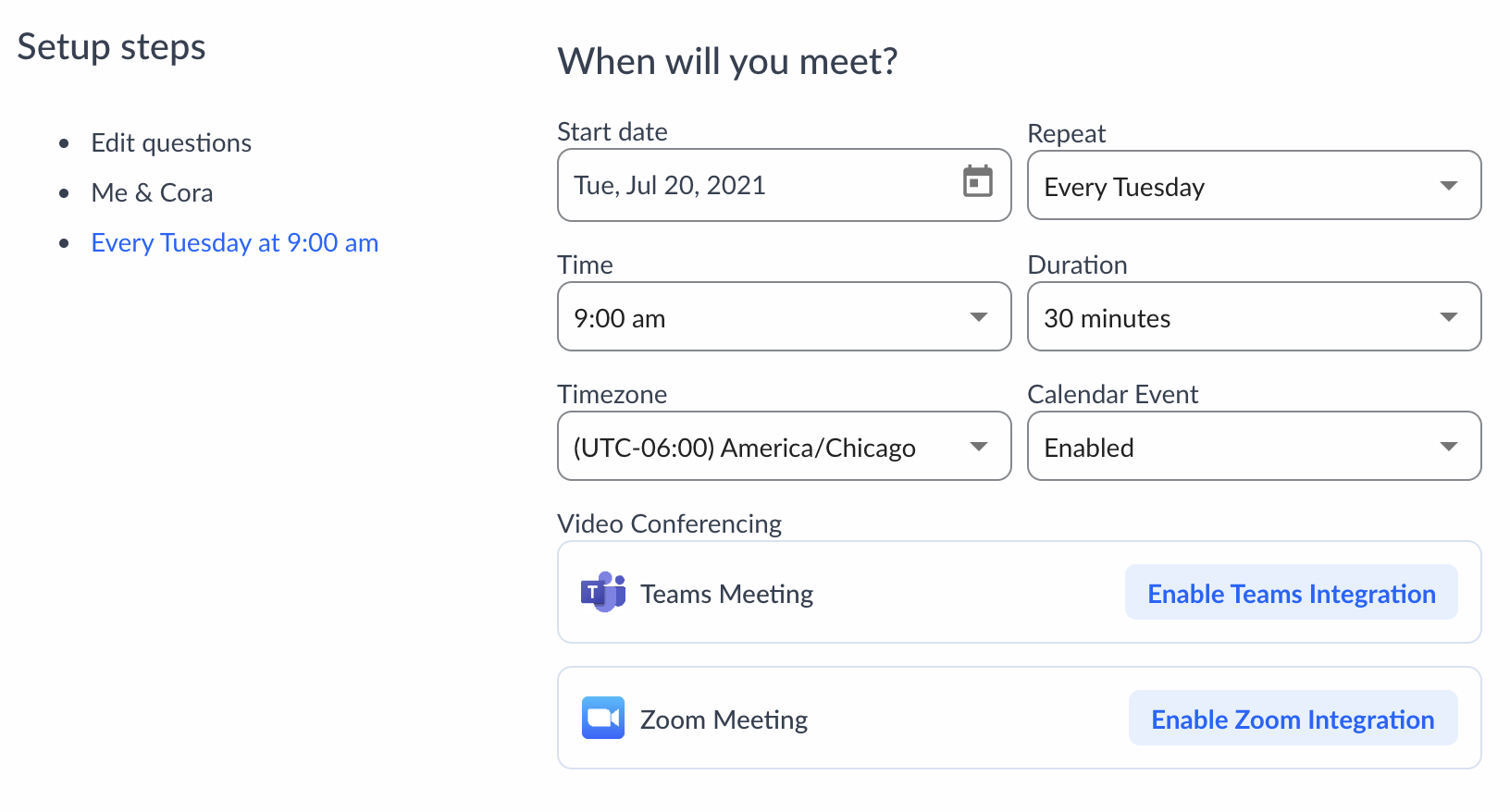Select a start date, every or every-other week frequency, meeting time, and duration.
