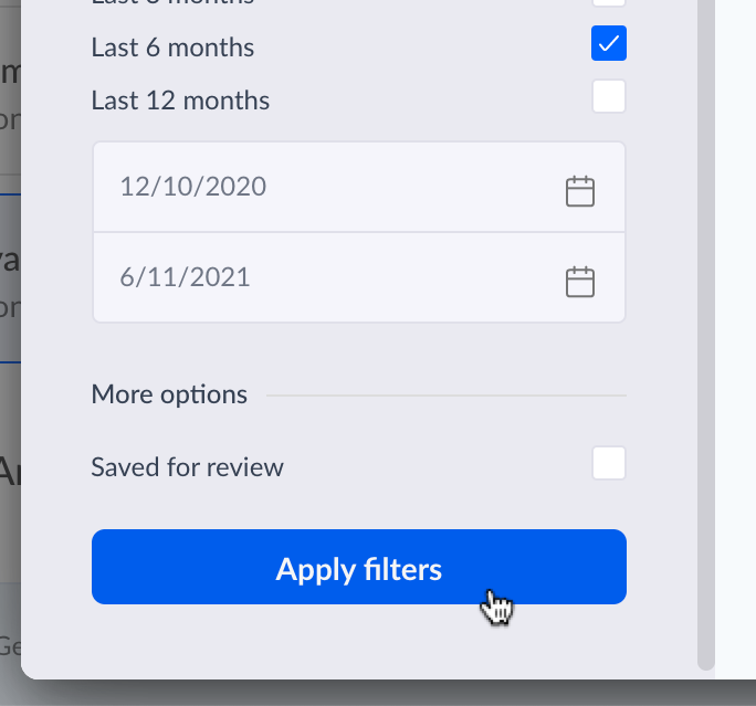 Filter your history by an automatic date range (3 months, 6 months, 12 months), or choose a custom date range.