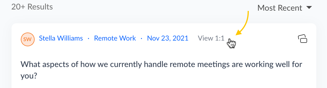 Hover over a specific result, and the user's name, question category, and date at the top will turn blue and it will say "View 1:1".