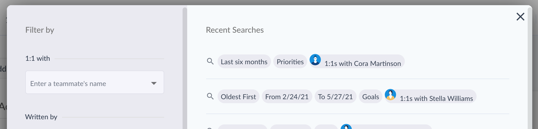 Managers: Using Search to help recall things you've discussed with a team member is a great way to encourage them and acknowledge their progress. Search helps you see the story arc of your team member’s 1:1s, which is great for giving developmental input.