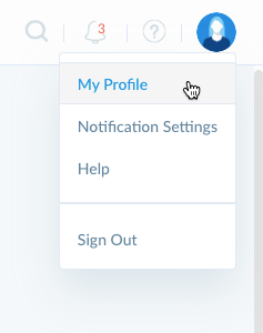 To view or edit your profile information, click on your initials or photo in the upper right corner of any screen and choose My Profile from the menu.